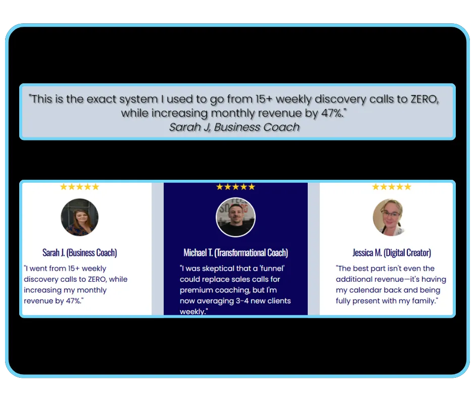 I’ve already done the work for you after helping over a dozen clients in B2C and B2B niches replace endless discovery calls with a gateway into their premium offers.