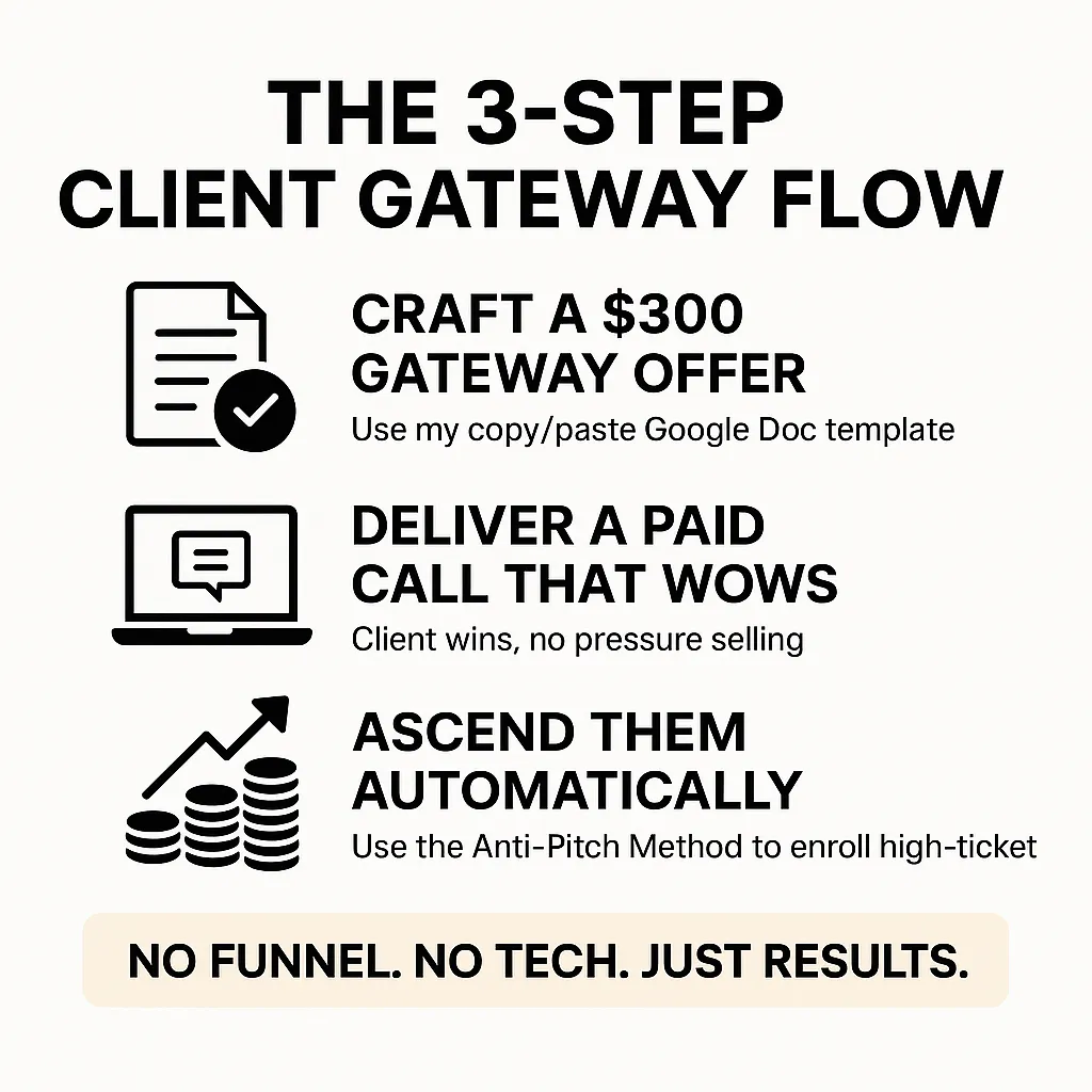 Gateway Offer™ Pricing Formula – Set the perfect price point between $100-$300 that attracts serious clients while creating a profitable front-end revenue stream.